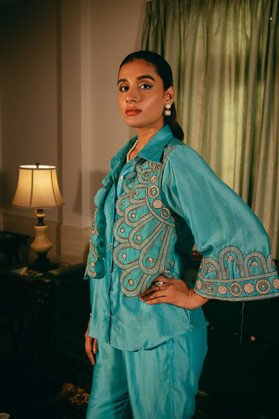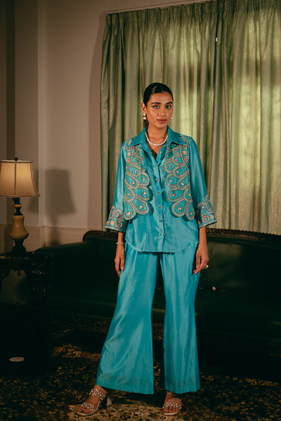 Silk chanderi shirt with attached koti,paired with bootcut pants