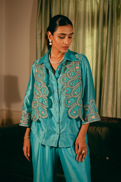 The silk chanderi shirt with attached koti, is embroidered with thread and zari,paired with bootcut pants